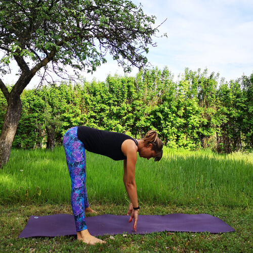 → In der Ausatmung beugst du dich aus der Hüfte mit langem Rücken nach vorn. Komme zunächst in einen 90 Grad Winkel.