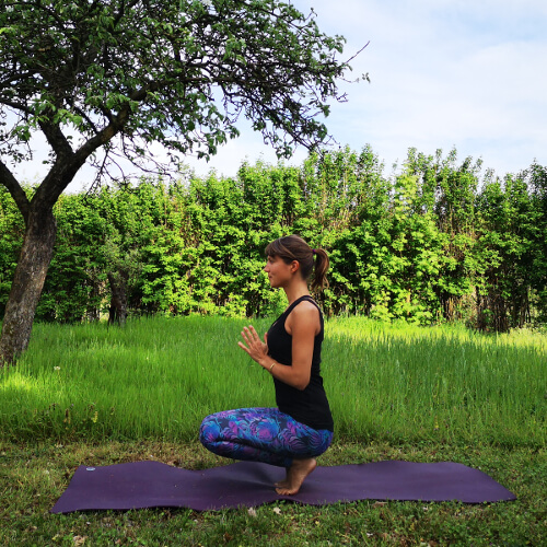 → Komme im Stand auf deine Zehenspitzen und nimm deine Hände vor dem Herzen zusammen. Lasse deine Fersen gehoben und beuge deine Beine langsam bis du in der Hocke bist (wenn deine Knie gesund sind).→ Bleibe für einige Atemzüge mit aufrechtem Rücken in der Hocke.