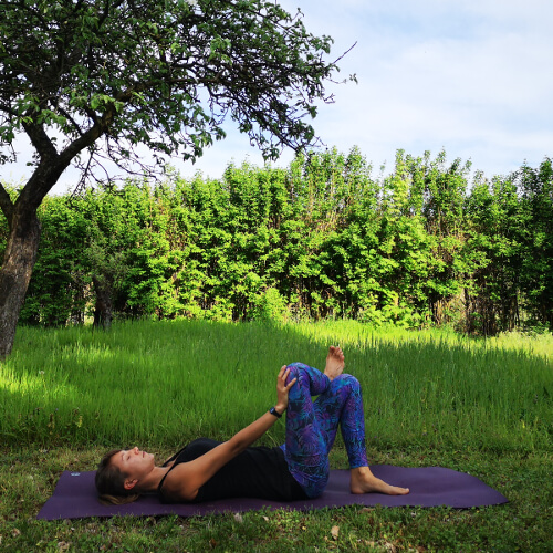 → Du kannst nun entweder dein rechtes Knie sanft mit Hilfe der Hand nach außen drücken oder du umgreifst deinen linken Oberschenkel mit deinen Händen und ziehst ihn vorsichtig zu dir heran. So verstärkst du die Dehnung.