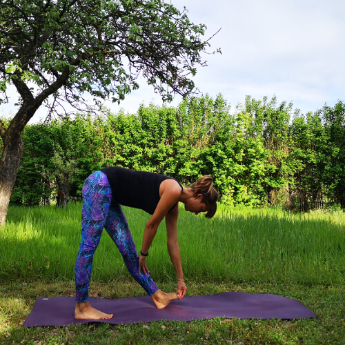 → Mit der Ausatmung schwingst du das Bein nach vorne, sodass dein Fuß innen neben der rechten Hand zum Boden kommt. Dein Knie bleibt über dem Sprunggelenk. Dann kannst du deine Hände innen vom Fuß zum Boden bringen.