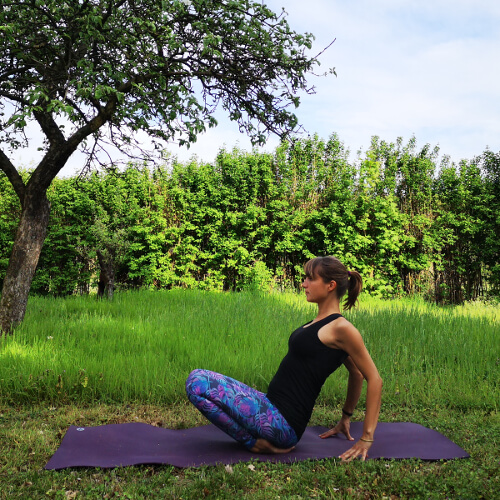 → Um aus der Position zu kommen, aktiviere deine Beine und dein Zentrum. Richte deinen geraden Rücken einatmend wieder auf.